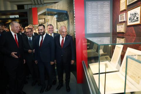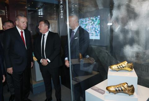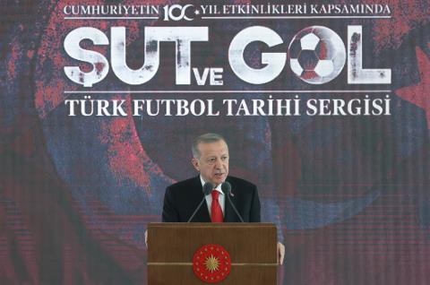 Cumhuriyet’in 100. yılı aktiflikleri kapsamında, “Futbol kardeşliktir” temasıyla Cumhurbaşkanlığı Külliyesi Stant Salonu’nda düzenlenen “Şut ve Gol: Türk Futbol Tarihi Sergisi”, Cumhurbaşkanı Recep Tayyip Erdoğan’ın iştirakiyle açıldı.