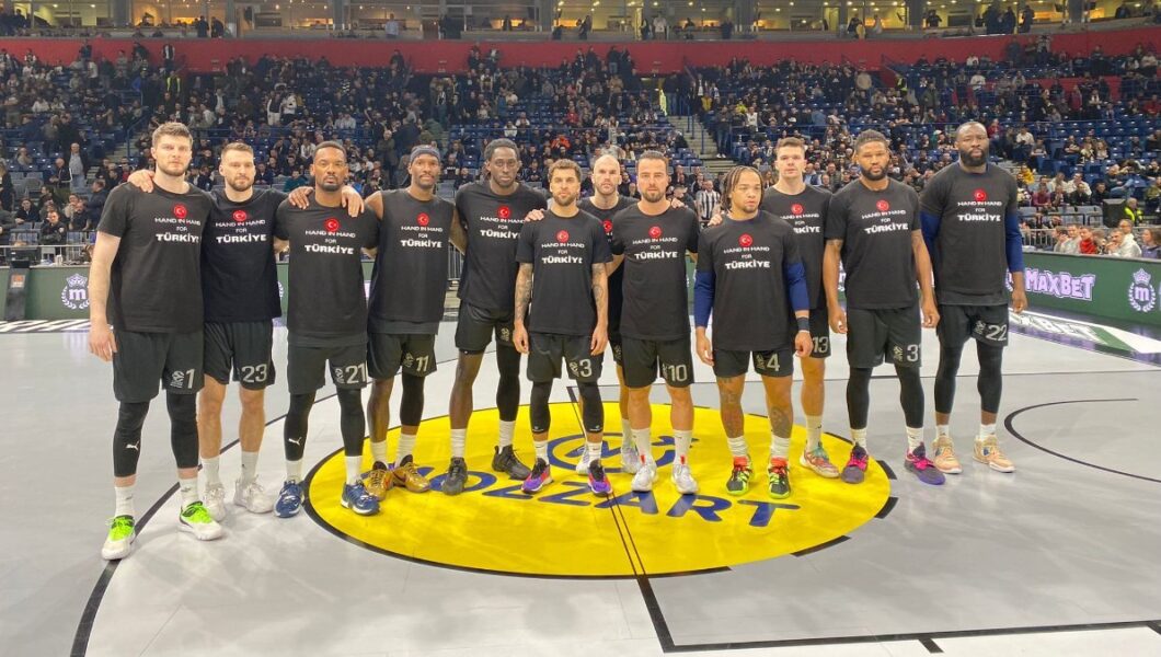 ‘Türkiye İçin El Ele; birlikte Güçlüyüz’ tişörtleriyle parkeye çıkan Fenerbahçe, müsabakada ‘Siyah’ forma ile uğraş etti.