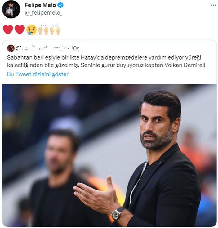 Bir Devre Galatasaray forması giyen Felipe Melo, yaşanan zelzele felaketiyle ilgili toplumsal medyada paylaşım yaparken göz yaşlarını tutamayan Volkan Demirel’le ilgili takviye iletisi yayınladı.